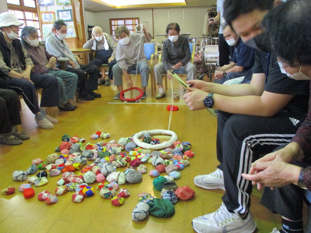 いつものように 2022年09月23日 9月も残すところ後1週間となりました。 敬老週間も終わり、午後から、いつものように手芸・ゲーム等の活動に参加されています。 文化祭にむけての作品作りは進んできています。 縫い物の方は足ふきマットを作っておられます。 ゲームは輪を投げておじゃみがどれだけとれるかの個人戦です。皆さんたくさん取ろうと一生懸命に投げたり引いたりしておられました。本日の最高は30個でした。 朝、夕涼しくなってきています。体調を崩さないように気を付けましょう。