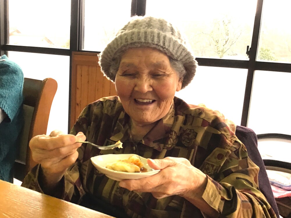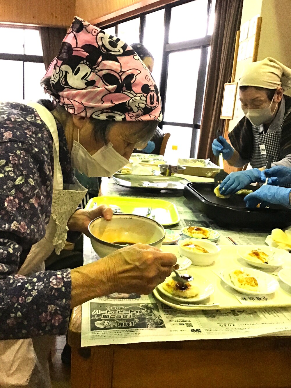じゃが芋餅 2024年02月21日 今日は、皆さんとじゃが芋餅作りに挑戦しました。 蒸したじゃが芋に、白玉粉と絹豆腐を混ぜたものを丸めていきます。 蓋をして焼くと良い匂いがしてきました。 両面に焦げ目を付けて、 砂糖醤油をかけたら出来上がり。 「とても柔らかいね。」 「美味しいなぁ」 おやつの時間を皆さん楽しんでおられました。 また、楽しくクッキングしましょう。