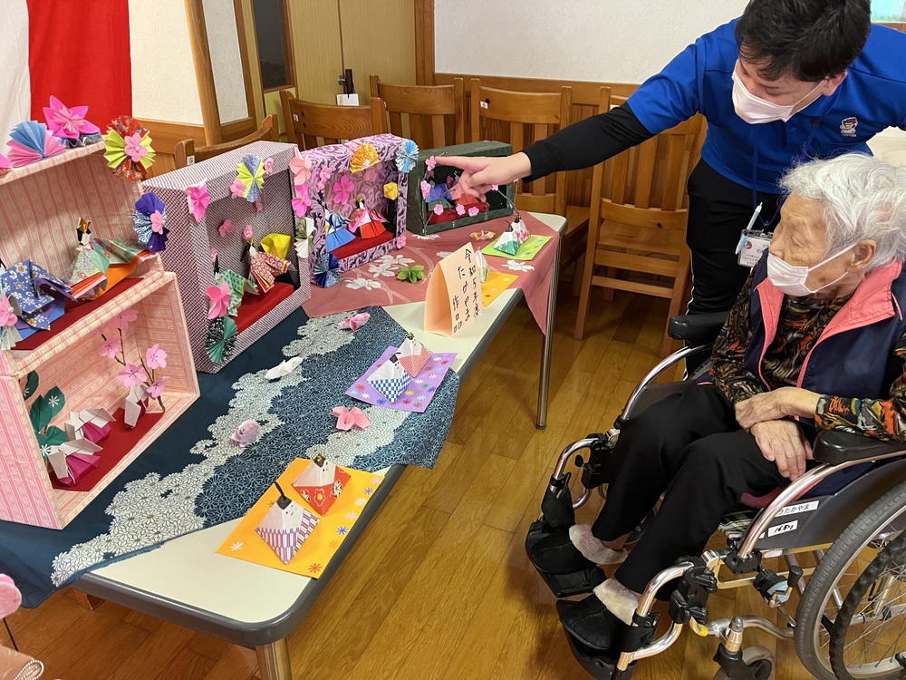 ひな祭り展も今日まで 2024年03月02日 今週開催してきた、ビラたかやまひな祭り展も 今日までの展示となります。 どんなものが置いてあるのかな。 そんな期待を抱いて歩く展示場所までの移動も、良い歩行訓練となったのではないでしょうか。 一週間を通して、沢山の利用者の皆さんにご覧頂きました。 今年のひな祭りを、楽しんで頂けましたでしょうか。
