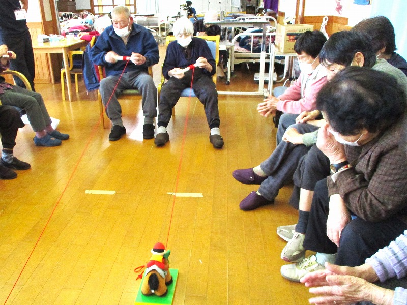 デイサービスでは、馬人形を紐で巻き取るゲームや、輪投げなど、様々なゲームを通して、楽しみながら体を動かしています。